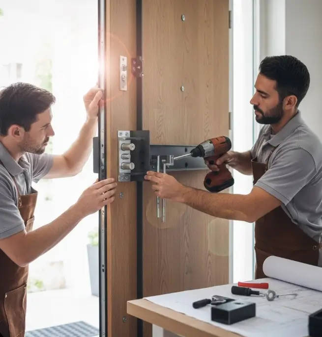 Deux serruriers en train de blinder une porte d’entrée