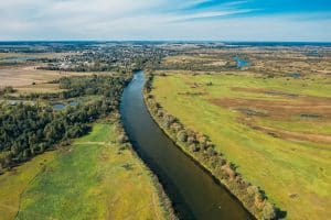 Chachersk, Belarus. Aerial View Green Meadows And Sozh River Landscape In Sunny Summer Day. Top View Of Beautiful European Nature From High Attitude In Summer Season. Drone View. Bird’s Eye View