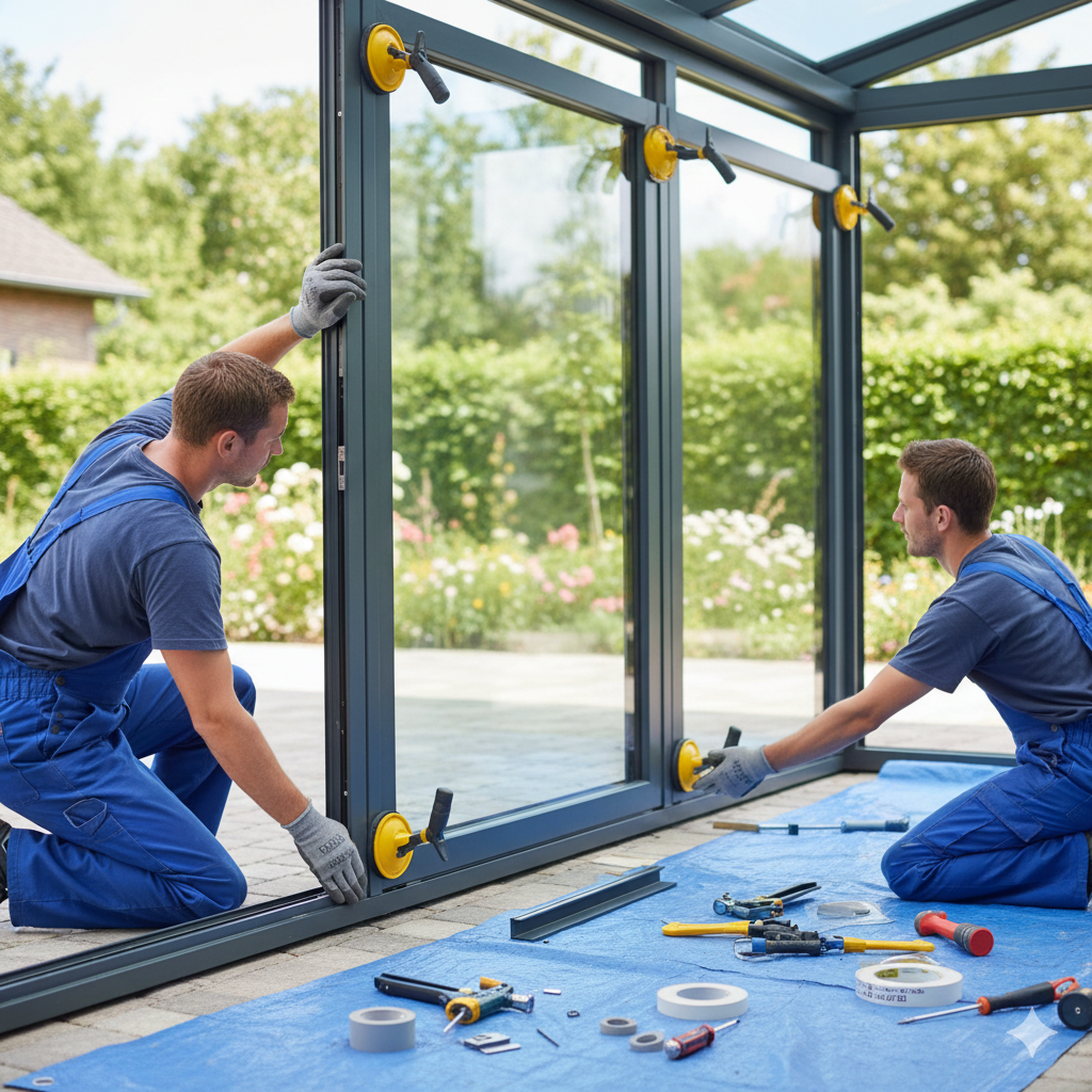 Deux vitriers en train d’installer une véranda chez des particuliers