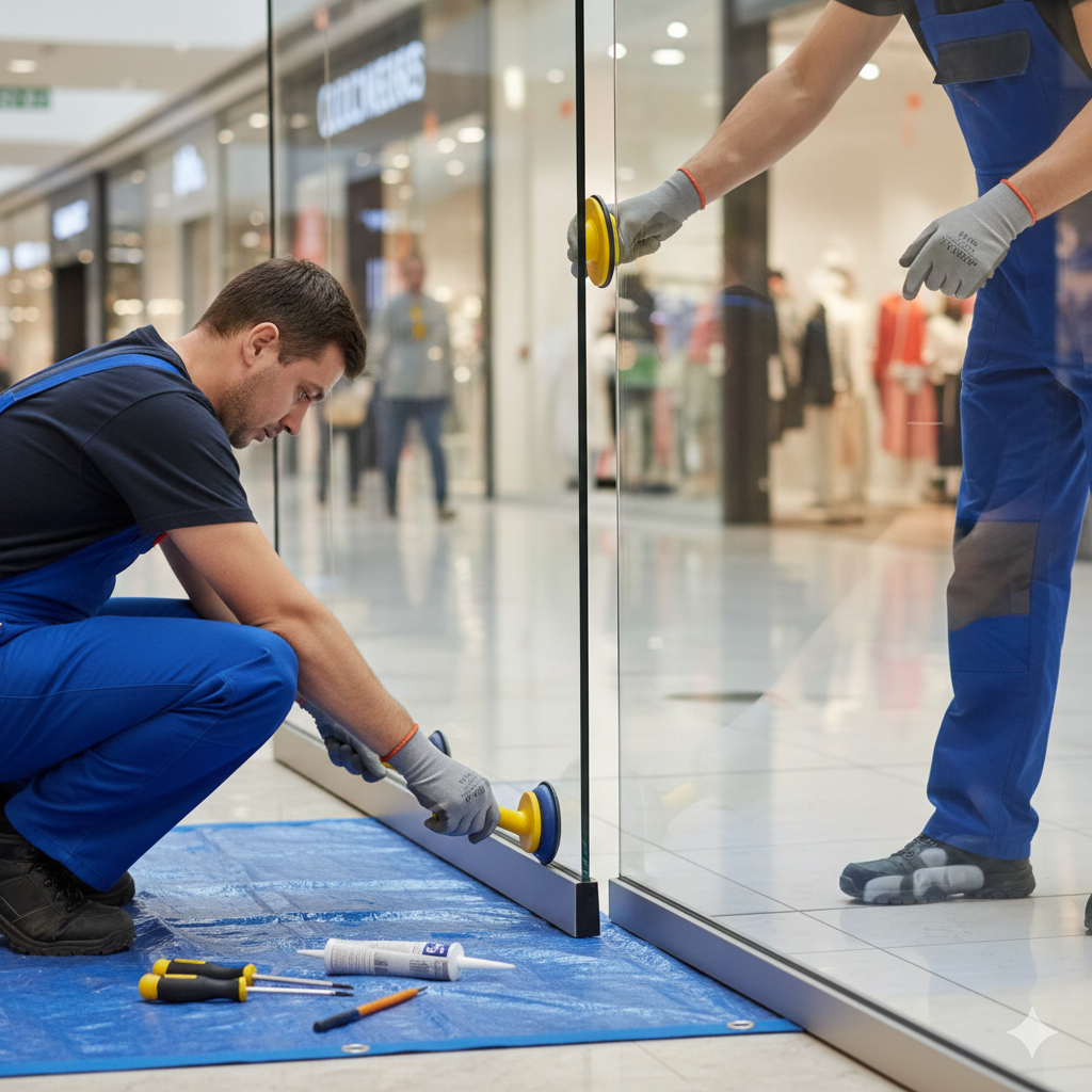 Deux vitriers en train de remplacer une vitrine de magasin au centre commercial